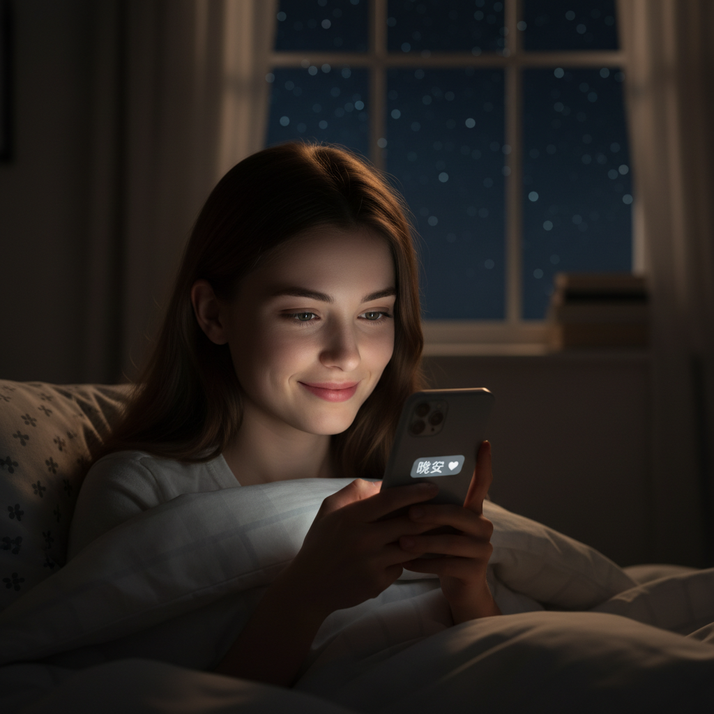 深夜手机屏幕亮起 一条晚安短信带来温暖慰藉 窗外星光闪烁 女孩握着手机露出安心微笑