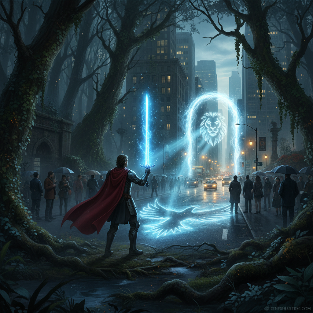 童话勇者手持发光宝剑穿越幽暗森林 照亮现实世界的城市街道 象征勇气与希望