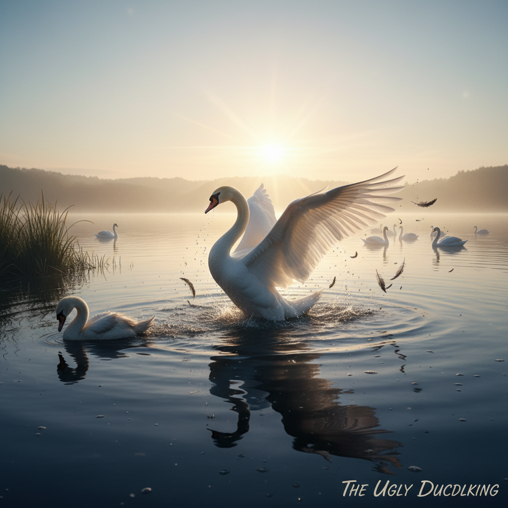 童话故事中丑小鸭变成天鹅的蜕变场景,象征自我认同与成长,在逆境中坚持本心迎来光明