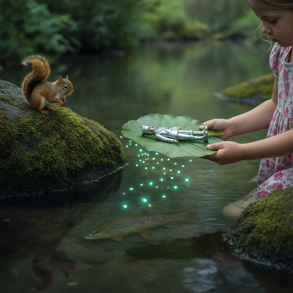 湍急的水流带着他穿过长满青苔的石缝,银色的制服在阳光下闪烁。他遇见衔着浆果的松鼠,躲过跃出水面的鳟鱼,用坚定的眼神面对每个漩涡。