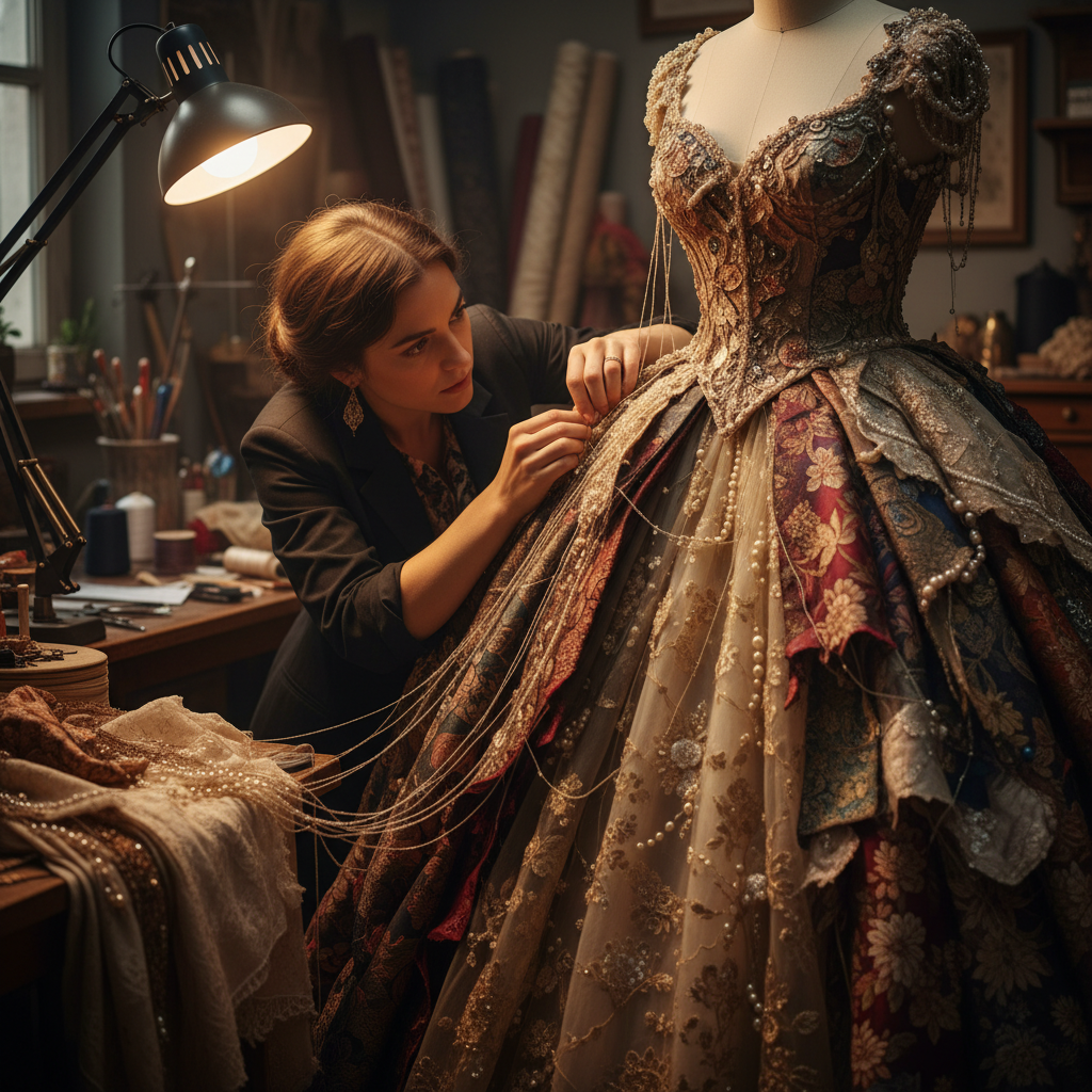 一位年轻裁缝在灯光下专注缝制破碎布料 飞针走线将碎片拼接成华丽礼服 展现化腐朽为神奇的精湛手艺