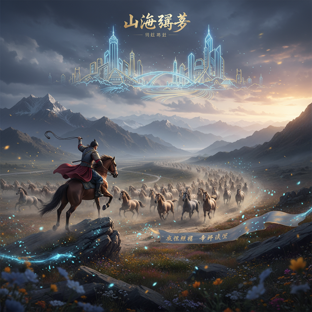 山海寻梦前路迢迢,跃马扬鞭万马奔腾,团结奋斗共绘蓝图,将宏伟愿景转化为幸福现实