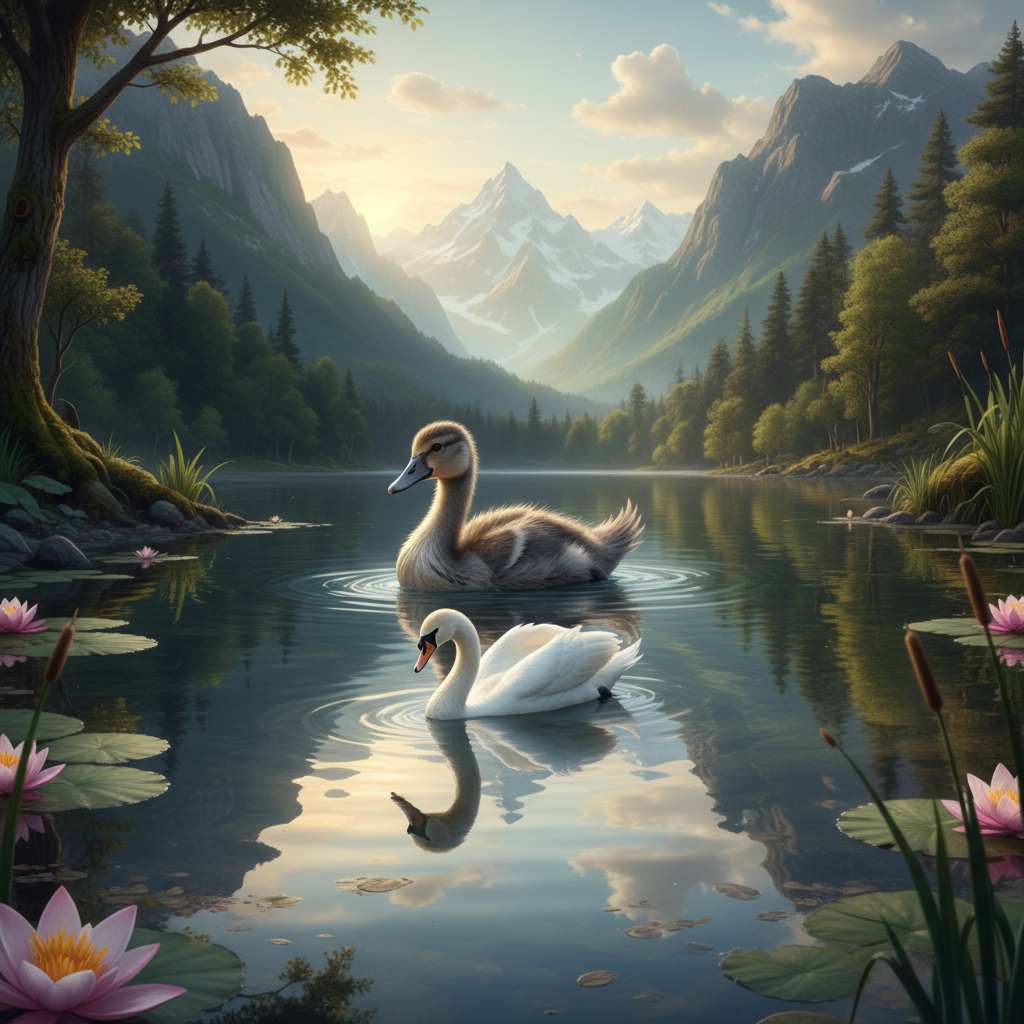 一只丑小鸭在清澈湖水中看到自己的倒影 发现自己是一只优雅的天鹅 周围是广阔的自然环境 象征着自我认知的觉醒和真实身份的发现